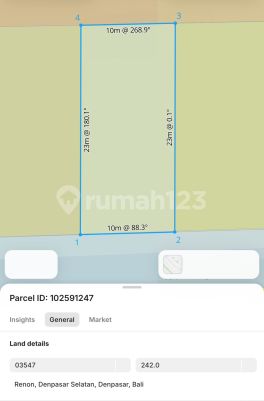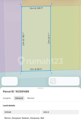 ForSale! Tanah Premium Kawasan Elite RENON, Denpasar Bali 1 menit ke Lapangan Renon 1 menit ke Plaza Renon 5 menit ke Swalayan Tiara Dewata 8 menit ke Rumah Sakit Bross 15 menit ke Pantai Sanur 15 menit ke International Hospital Luas Tanah 11,83m2 Lebar Depan Timur 23 meter Lebar Depan Selatan 51 meter Posisi Tanah Hook ITR Perumahan Akses Jalan Utama Pemuda 8 meter Akses Jalan Ciung Wenara 6 meter 4 Sertifikat Hak Milik (SHM) Harga IDR 2.300.000.xxx / Are Negotiable