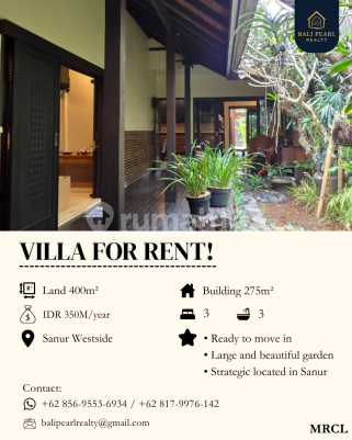 Exclusive Villa for Rent - Sanur Westside Famous for expatriate living, just nearby Bali Mandara Hospital. Villa Details: Land Size: 400 m² Building Size: 275 m² 3 Bedrooms (fully furnished) Luxury Bathrooms Stylish Living Room with Authentic Design Fully Equipped Kitchen Garden & Outdoor Space Private Parking / Carport :zap: Electricity & Water Ready * Why This Villa? v Located on a prime main road - convenient for daily activities v Exclusive, fully furnished with tasteful interior design v Spacious layout with tropical vibes - perfect for families or expats v Safe, secure, and in a well-established neighborhood Price: Negotiable - Open Price: Rp 350,000,000/year Contact us for more details and viewing! WhatsApp : - 0856-9553-6xxx - 0817-9976-xxx