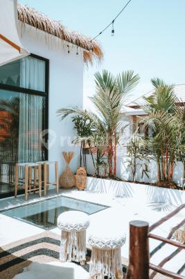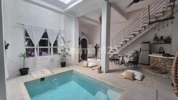 BEACH SIDE SANUR Luxury 1-Bedroom Villa Rental Details - Rent: IDR 250,000,000 per year - Electricity: Not included (paid by tenant) Included in Rent - Pool maintenance - Garden maintenance - Water supply - Wi-Fi - Housekeeping 2× per week (general cleaning) A thoughtfully designed, two-storey 1-bedroom residence offering calm, privacy, and effortless beachside living in one of Sanur's most walkable pockets. Natural textures, stone walls, and soft neutral finishes define the interior, with an open-plan layout centred around a private indoor pool beneath a skylight, filling the space with light throughout the day. Designed and ideal for expats, professionals, or remote workers seeking a beautiful, low-maintenance home in beachside Sanur. ✨ Property Highlights - 1 spacious bedroom - Two-storey layout with distinct living zones - Private indoor pool with skylight - Open-plan living and dining area - Compact kitchen for basic cooking - Upstairs lounge with oversized 3m round sofa - Private balcony for relaxing - Bathroom with bathtub and walk-in shower - Fully furnished with curated interiors - Quiet street, walking distance to the beach - Close to cafés, shops, and daily amenities