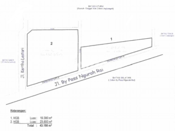 Luas Tanah 1: 19.380 m² Luas Tanah 2: 23.800 m² Total: 43.180 m² Lebar Depan: 324 meter Sertifikat: HGB Harga Jual: Rp. 650.000.xxx.000 Deskripsi: - Lokasi di jalan utama BYPASS - Posisi sudah ada jembatannya - Langsung bisa dibangun - Sangat strategis untuk usaha - Tanah datar & padat - Hadap ke selatan - Bisa dibangun perumahan, gedung ataupun gudang