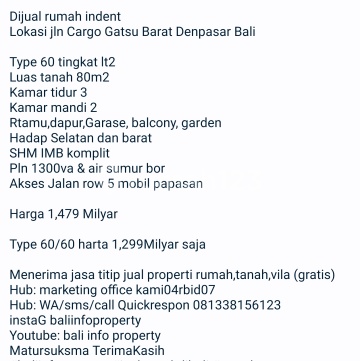 Dijual rumah indent Lokasi jln Cargo Gatsu Barat Denpasar Bali Type 60 tingkat lt2 Luas tanah 80m2 Kamar tidur 3 Kamar mandi 2 Rtamu,dapur,Garase, balcony, garden Hadap Selatan dan barat SHM IMB komplit Pln 1300va & air sumur bor Akses Jalan row 5 mobil papasan Harga 1,479 Milyar Type 60/60 harta 1,299Milyar saja Menerima jasa titip jual properti rumah,tanah,vila (gratis) Hub: marketing office kami04rbid07