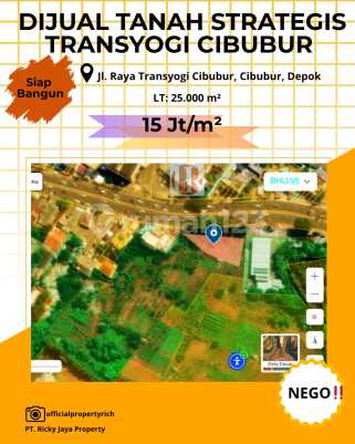 Dijual BU Lahan Strategis di Pinggir Jalan Transyogi Cibubur Luas 2,5 Hektar Tampak Depan ± 80 Meter Posisi Samping SPBU Shell – Jl. Transyogi Cibubur Harga: Rp 15 Juta/m² Surat Girik – Sudah Termasuk Pengurusan SHGB Keunggulan Lokasi: * Tanah datar & siap bangun * Tepat di pinggir jalan raya utama * Dekat akses Tol Cibubur, Tol Jatikarya, Tol Cimanggis–Cibitung * Dekat LRT Harjamukti, Busway Cibubur * Dikelilingi Mall & Hunian Modern: Mall Trans Studio Cibubur Junction Ciputra Grand Raffles Hills, Citra Grand, Kota Wisata, Legenda Wisata, dsb. Peruntukan Ideal: Sekolah Internasional, Universitas, RS, Showroom, Perkantoran, Gedung Serbaguna, dll. Segera Hubungi Kami! Lahan strategis ini siap mendukung pertumbuhan investasi Anda di kawasan emas Cibubur Kumala