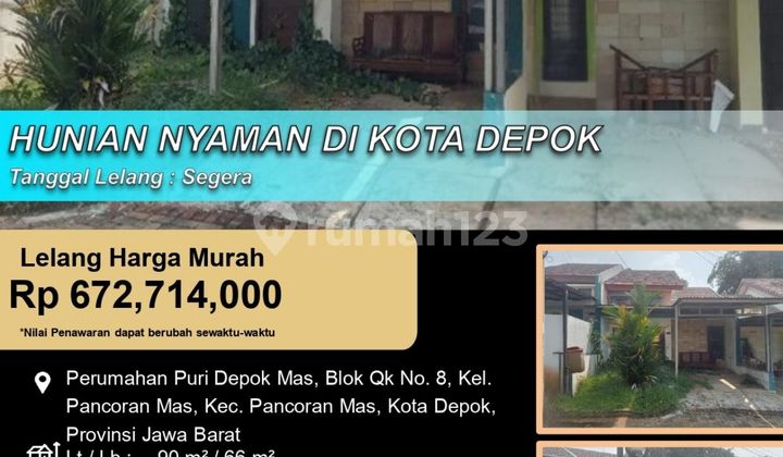 Rumah di Pancoran Mas. Cek segera rumah 1 lantai yang modern ini, dijual dengan pemandangan asri yang menambah nilai estetika di lingkungan hunian. Rumah ini berada di area strategis serta menawarkan lingkungan fasilitas yang lengkap, cocok untuk Anda yang menginginkan hunian nyaman. Spesifikasi Utama Properti: - Kamar Tidur: 2 - Kamar Mandi: 1 - Sertifikat: SHM - Sertifikat Hak Milik - Arah Bangunan: Menghadap Barat - Kondisi Perabotan: Unfurnished Dilengkapi dengan: - Akses Parkir. - Taman. Fitur unggulan: - Dekat Akses Tol. - Dekat Pusat Perbelanjaan. - Dekat Fasilitas Kesehatan. - Aset Lelang. Terletak di Pancoran Mas, rumah ini memberikan kemudahan akses ke berbagai fasilitas menarik. Dengan harga Rp. 672.710.xxx, anda bisa memiliki hunian premium yang sudah siap huni dan bersertifikat SHM - Sertifikat Hak Milik. Jangan lewatkan kesempatan untuk menikmati investasi di kawasan Pancoran Mas yang nyaman ini! Hubungi segera untuk informasi lebih lanjut!