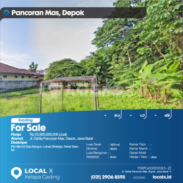 (Rp16jt/m2) Siap Bangun, Lokasi Strategis, Dekat Sekolah For Sale - Jual Tanah Kavling Dahlia Pancoran Mas, Depok, Jawa Barat Harga. Rp 25,920,000,000 (Jual) Deskripsi Properti. (Rp16jt/m2) Siap Bangun, Lokasi Strategis, Dekat Sekolah Luas Tanah. 1620 m2 Dimensi. 30x54 Luas Bangunan. 1620 m2 Sertipikat. SHM Kamar Tidur. - Kamar Mandi. - Garasi Mobil. - Hadap / View. Utara LOCAL X Kelapa Gading ******** ⓪②① ②⑨⓪⑥ ⑧⑤⑨⑤ P3KPG-0000xxxx-ZZ-J
