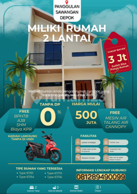 PROMO TERBATAS Lokasi Panggulan Pengasinan Sawangan, Depok Booking hanya Rp 3.000.000! Tanpa DP, bisa langsung proses sampai akad. - Hunian 2 Lantai Modern - Harga 500 Jutaan Saja! - Cicilan Ringan cuma 3 Jutaan - TANPA DP alias 0% - GRATIS: - Biaya-biaya - Canopy - Motor Tanpa diundi! - Spesifikasi: - 2 Kamar Tidur - 2 Kamar Mandi - Dapur Nyaman - Carport - Lokasi Strategis: Dekat pusat kota dan akses mudah STOK TERBATAS! Hanya 8 unit lagi. BOOKING SEKARANG SEBELUM KEHABISAN! - Tipe Unit 2 Lantai: - 67/61 - 67/64 - 67/56 - 67/70 - PROMO SPESIAL: - Gratis 1 unit Motor - Gratis Canopy - Gratis Jetpump dan Toren Air - Gratis Biaya KPR dan Sertifikat SHM - Gratis semua biaya: Notaris, BPHTB, Appraisal, Asuransi Jiwa dan Kebakaran - Akses Strategis: - 10 menit ke Jl. Raya Parung - 10 menit ke SMPN 10 - 5 menit ke RS CITRA ARAPIQ - 10 menit ke Ciplaz dan Pasar Parung - 15 menit ke The Park Sawangan - 10 menit ke Stasiun CITAYAM - Dekat Tol BORR dan Tol Desari