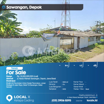 (Rp3jt/m2) Peruntukan Untuk Cluster Perumahan, Lokasi Strategis Di Jalan Raya, Dekat Tol Sawangan, Dekat Sekolah For Sale - Jual Tanah Abdul Wahab Sawangan, Depok, Jawa Barat Harga. Rp 1650000xxxxJual) Deskripsi Properti. (Rp3jt/m2) Peruntukan Untuk Cluster Perumahan, Lokasi Strategis Di Jalan Raya, Dekat Tol Sawangan, Dekat Sekolah Luas Tanah. 5500 m2 Dimensi. 37x Luas Bangunan. 5500 m2 Sertipikat. SHM Kamar Tidur. - Kamar Mandi. - Garasi Mobil. - Hadap / View. Barat LOCAL X Kelapa Gading ******** ⓪②① ②⑨⓪⑥ ⑧⑤⑨⑤ P3KPG-0000xxxx-EI-J