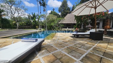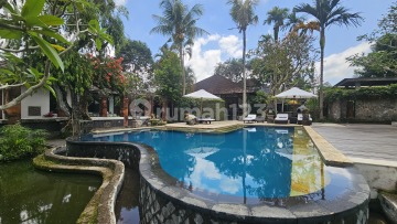 Tucked away in a peaceful pocket of Sayan, Ubud, this charming villa compound blends traditional Balinese character with relaxed livability. Surrounded by rice fields, gardens, and tall palms, the property offers the kind of calm that defines classic Ubud living; quiet, breezy, and deeply green. The residence spans approximately 12 are (1,200 m²) and features a 4-bedroom layout divided into three separate buildings: a 2-bedroom main house, a guest studio, and a pool suite facing the water. At its center, a freeform swimming pool and fish pond flow naturally through the landscape, bordered by tropical plants and soft lawns, creating an atmosphere that feels both private and open to nature. The enclosed kitchen and dining pavilion anchors the home’s social area, featuring natural stone floors, solid wood furnishings, and high ceilings that keep the space cool throughout the day. The setup includes a brick pizza oven and BBQ corner, ideal for small gatherings. Inside, bedrooms are spacious, well-furnished, and air conditioned, while bathrooms mix indoor and outdoor layouts finished in natural stone. Classic touches like thatched roofs, carved wood details, and antique décor give the home a timeless, soulful presence. Located only 10 minutes from central Ubud, the villa sits near the Ayung River, Four Seasons Sayan, Moksa Café, and Alchemy, offering convenient access to Ubud’s best dining and wellness venues while remaining quiet and residential. Key Features • Land size: ±1,200 m² (12 are) • Layout: 4 bedrooms total (2BR main house, 1BR guest studio, 1BR pool suite) • Central pool with fish pond and tropical garden • Enclosed kitchen + dining pavilion (Kitchen 25.5 m², Dining 36.4 m²) • Brick pizza oven + BBQ area • Fully furnished with solid wood interiors • Staff quarters and guest WC • Car access and parking • Electric hot water + PLN 2,300 W power supply Lease Terms Yearly lease (1–2 years, paid upfront) Rp 80,000,000 per month (≈ Rp 960,000,000 per year)