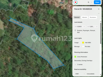 Dijual Tanah Luas di Buahan, Gianyar – Ubud Bali | Cocok untuk Resort dengan View Lembah dan Pegunungan Harga 100 Juta per are Total harga 5,8 M Spesifikasi Tanah: Luas Tanah: 58 are (5.800 m²) Panjang: ± 200 meter Lebar Depan: ± 55 meter Pemandangan: Pegunungan dan lembah sungai Suasana: Jungle vibe, tenang, alami, dan eksotis Keunggulan Lokasi: Berbatasan langsung dengan hotel mewah bintang 5 (Nandini Jungle Resort) Dekat Jungle Swing Bali Banyak Villa yang sudah dibagun di area ini Dekat daun lebar Villa Dekat RSU Payangan
