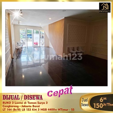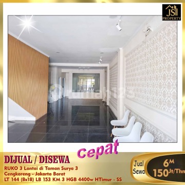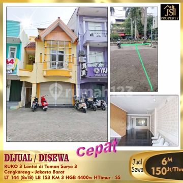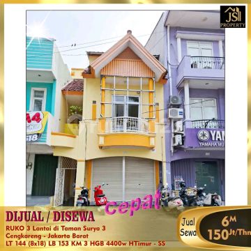DIJUAL/DISEWA RUKO 3 Lantai di Taman Surya 3 Cengkareng - Jakarta Barat Bebas Banjir Selangkah Pasar Palem 5 menit Green Sedayu Mall 15 menit RS Ciputra 15 menit toll dalam kota 25 menit Bandara Soetta Luas Tanah 144 m² Dimensi 8x18 m² Luas Bangunan 153 m² 3 Lantai Kamar Mandi 3 Listrik 4.400 Watt Air PAM Sertifikat HGB Hadap Timur Harga Jual 6M Nego Harga Sewa 150Jt/Thn Nego - SS (Bisa disewa perlantai)