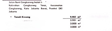 Tanah di jalan bumi cengkareng indah Jakarta barat Belakang Satyagama Luas tanah 9.901 m² Terdiri dari 3 sertipikat HGB NJOP Rp. 13 juta / mtr Dijual Rp. 12 juta / mtr = 118.812.xxx.000