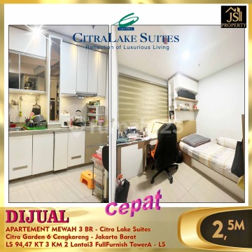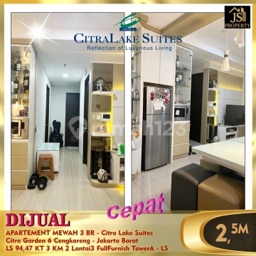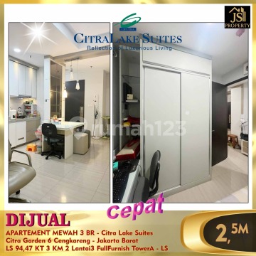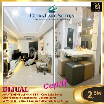 DIJUAL APARTEMENT MEWAH 3 BR - Citra Lake Suites Citra Garden 6 Cengkareng - Jakarta Barat Luas 94.47m² 3 kamar tidur 2 kamar mandi Full Furnished Lantai 3 Tower A Harga 2.5M Nego -
