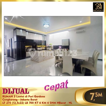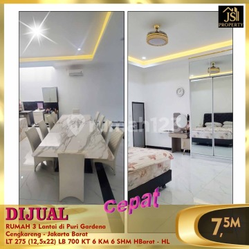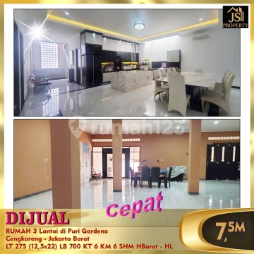 DIJUAL CEPAT RUMAH 3 Lantai di Puri Gardena Cengkareng - Jakarta Barat Lokasi dekat dengan banyak sekolah internasional,nasional plus,Nasional,pasar,supermarket,mall,Rs Hermina,RS keluarga Luas Tanah 275 M² Luas Bangunan 700 M² Ukuran 12,5 x 22 M² 3 lantai Kamar Tidur 6 Kamar Mandi 6 Listrik 6400 Kwh Air PAM Hadap Barat Semi Furnished Sertifikat SHM Interior ; 4 unit AC 1 PK, 2 unit AC 2 PK, 2 unit water heater,kitchen set design modern dll Lantai 1, luas dan plong bisnis online sangat cocok,garasi bisa 10 mobil Harga 7,5 M - HL