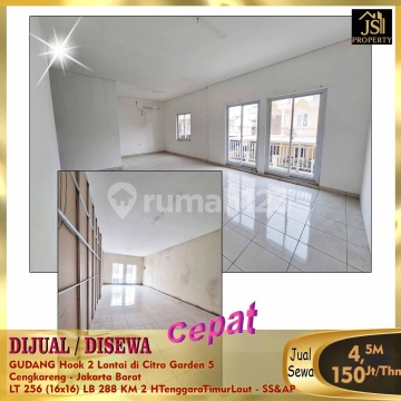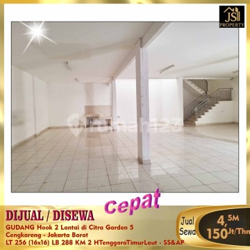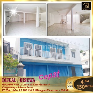 DIJUAL / DISEWA GUDANG Hook 2 Lantai di Citra Garden 5 Cengkareng - Jakarta Barat Luas Tanah 256 m² Dimensi 16x16 m² Luas Bangunan 288 m² 2 Lantai Kamar Mandi 2 Listrik 3.500 Watt Air PAM Sertifikat SHGB Hook Hadap depan Tenggara Hadap samping Timur Laut Harga Jual 4,5 M Nego Harga Sewa 150Jt/Thn Nego - SS&AP