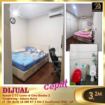 DIJUAL Rumah 2 1/2 Lantai di Citra Garden 2 Cengkareng - Jakarta Barat Jalan Lebar 3 mobil Carpot 2 mobil Luas Tanah 128 m² Dimensi 8 mx16 m² Luas Bangunan 280 m² 2 1/2 Lantai Kamar Tidur 4 Kamar ART 1 Kamar Mandi 2 Gudang 2 Semi Furnish Listrik 5500 Watt Air PDAM Sertifikat SHM PAM Harga 3.2M Nego