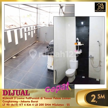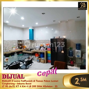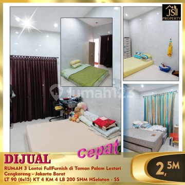 DIJUAL Siap Huni RUMAH 3 Lantai FullFurnish di Taman Palem Lestari Cengkareng - Jakarta Barat Bebas Banjir Selangkah Green Sedayu Mall 10 menit RS Ciputra 10 menit Pasar Laris (pasar modern) Luas Tanah 90 m² Dimensi 6x15 m² Luas Bangunan 200 m² 3 Lantai Kamar Tidur 3+1 Kamar Mandi 3+1 Full Furnish Listrik 2.200 Watt Air PAM Sertifikat SHM Hadap Selatan Harga 2,5 M Nego