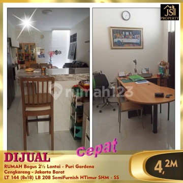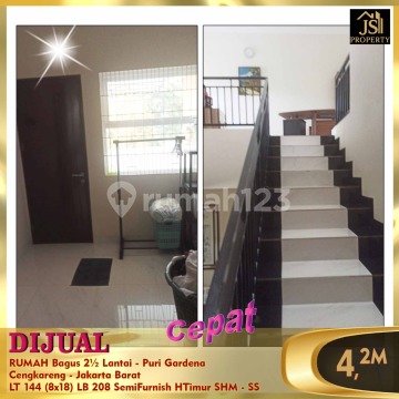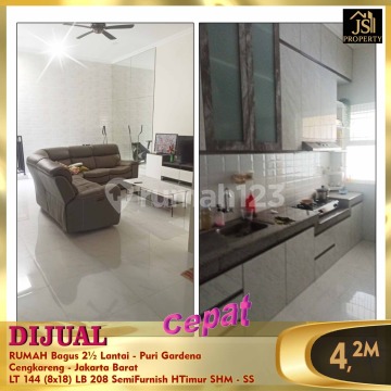 DIJUAL RUMAH Bagus 2½ Lantai - Puri Gardena Cengkareng - Jakarta Barat Bebas banjir Rumah depan taman 15 menit RS Mitra Keluarga 15 menit Sekolah Bunda Mulia 25 menit Bandara Soetta 15 menit jalan raya Daan Mogot Luas Tanah 144 m² Dimensi 8x18 m² Luas Bangunan 208 m² 2 ½ Lantai Kamar Tidur 4 Kamar Mandi 2 Semi Furnish Listrik 5.500 Watt Air WTP Sertifikat SHM Hadap Timur Harga 4,2 M Nego