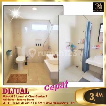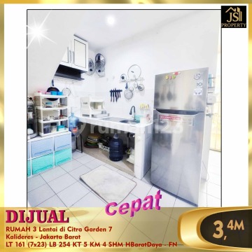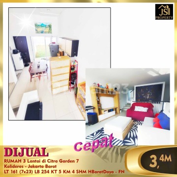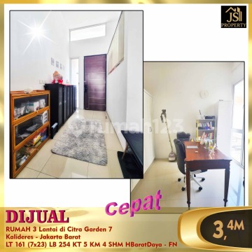 DIJUAL RUMAH 3 Lantai di Citra Garden 7 Kalideres - Jakarta Barat Luas Tanah 161 m² Ukuran Dimensi 7 x 23 m² Luas Bangunan 254 m² 3 Lantai Kamar Tidur 4 + 1 Kamar Mandi 3 + 1 Listrik 5.500 Watt Air WTP Hadap Barat Daya SHM Bebas Banjir , Lokasi Strategis, Aman & Tenang. Harga 3,4M Nego Erna Tjioe (oc-fn)