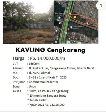 Dijual Tanah Komersial Area Cengkareng Jakarta Barat I LT 16.600 m² Jalan Lingkar Luar, Cengkareng Timur SHGB Zona Unggu, Komersial Dekat perempatan Cengkareng, dekat pintu tol Tanah padat NJOP 2021 Rp 13,125 jt Harga Jual Rp 14 Juta/meter Harga di luar pajak (NEGOTIABLE) DIRECT OWNER RG-Z #212717