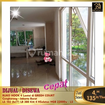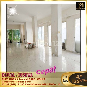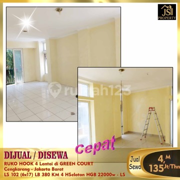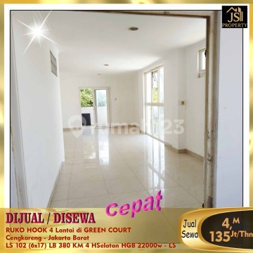 DIJUAL/DISEWA RUKO HOOK 4 Lantai di GREEN COURT Cengkareng - Jakarta Barat Bebas Banjir, Dekat dengan , cocok untuk gudang dan kantor Luas Tanah 102 m² Dimensi 6x17m² Luas Bangunan 380m² 4 Lantai Kamar Mandi 4 Listrik 22.000 Watt Air WTP Sertifikat SHGB Hadap Selatan Harga Jual 4 M Nego Harga Sewa135Jt/Thn