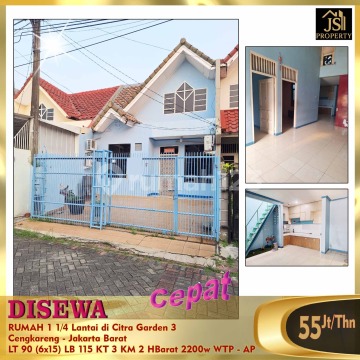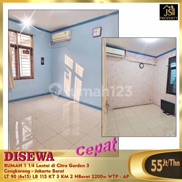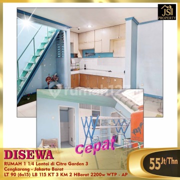 DISEWA RUMAH 1 1/4 Lantai di Citra Garden 3 blk C Cengkareng - Jakarta Barat Luas Tanah 90 m2 Luas Bangunan 115 m2 Ukuran 6 X 15 Jumlah lantai 1 1/4 Kamar Tidur 2 Kamar Pembantu 1 Gudang 1 Kamar mandi 2 Listrik 2.200 watt Air WTP Citra Hadap Barat Sertifikat SHM 3 unit AC 1 unit TV Harga 55Jt/Thn Nego