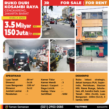 TSI/17883 For Sale / For Rent Ruko Duri Kosambi Raya, Cengkareng, 5x12 m², 3 Lt, SHM Harga Rp 3.5 MIlyar (Buy) / Rp 150 Juta /th (Rent) Alamat Cengkareng, Jakarta Barat Deskripsi Properti Ruko lokasi strategis, dekat kampus PLN, Superindo, Pertokoan, Stasiun KRL Rawa Buaya, Sekolahan, dll, kondisi baik, Luas Tanah : 80m (5x16), Luas Bangunan : 180m (5x12), 3 lantai, SHM Luas Tanah 80 m² Dimensi 5x16 Luas Bangunan 180 m² Dimensi 5x12 Jumlah Lantai 3 Perabotan - Kamar Tidur - Kamar Mandi 3 Garasi / Carport - Jalur Telepon - Daya Listrik - Hadap / View - Sertifikat SHM LJH Realty Taman Semanan Property Help ✆ 0212903xxxx