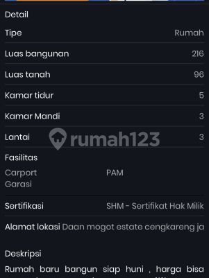 Luas Bangunan: 216 Luas Tanah : 96 Kamar Tidur: 5 Kamar Mandi : 3 3 Lantai Air PAM SHM Fasilitas: Carpot Garasi Harga : 2.5M hubungi ervina-GP Alsut 0812xxxxxxxx