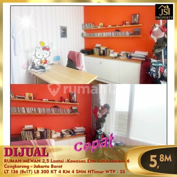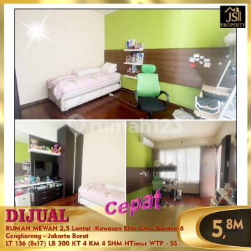DIJUAL RUMAH MEWAH 2,5 Lantai - Kawasan Elite Citra Garden 6 Cengkareng - Jakarta Barat 20 menit Bandara Soetta 10 menit RS Ciputra 10 menit Sekolah Citra Kasih 10 menit Green Sedayh Mall Luas Tanah 136 m² Dimensi 8 x 17 m² Luas Bangunan 300 m² 2,5 Lantai Mezanin Kamar Tidur 3+1 ART Kamar Mandi 3+1 ART Full Furnish : Semi (3 unit water heaters, 7 unit AC, interior) Living Room 1 Studio Room 1 Dry Pantry (2 burner stove, hood, dish washer) Wet Kitchen (2 burner stove) Listrik 5.500 Watt + 7.000 watt Air WTP, PDAM Sertifikat SHM Hadap Timur Harga 5,8 M Nego Hub : Fenny 0821xxxxxxxx