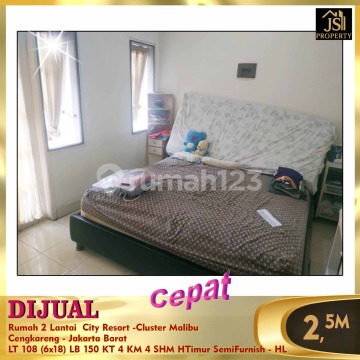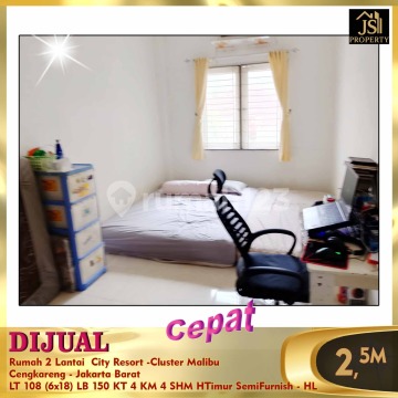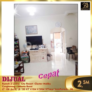 DIJUAL Rumah 2 Lantai City Resort -Cluster Malibu Cengkareng - Jakarta Barat Luas Tanah 108 M² Luas Bangunan 150 M² Ukuran 6 x 18 2 lantai Kamar Tidur 3+1 Kamar Mandi 3+1 Listrik 2,200 W Air PAM Hadap Timur Semi Furnished Sertifikat SHM Harga 2.5 M Nego Erna 0821xxxxxxxx oc-hl)