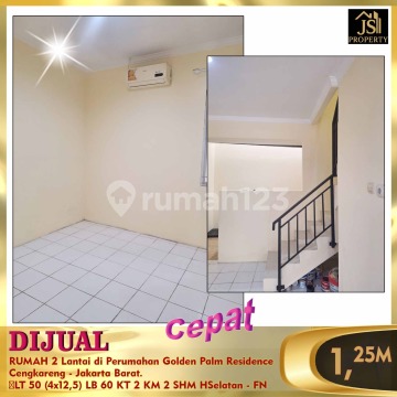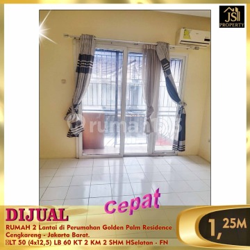 DIJUAL : RUMAH 2 Lantai di Perumahan Golden Palm Residence Cengkareng - Jakarta Barat. LT 50 (4x12,5) LB 60 KT 2 KM 2 SHM HSelatan - FN Luas Tanah 50 m² Ukuran Dimensi 4 x 12,5 m² Luas Bangunan 60 m² 2 Lantai Kamar Tidur 2 Kamar Mandi 2 Semi Furnished (AC 3 unit , Water Heater 1 unit) Listrik 2200 Watt Air PAM Hadap Selatan SHM Harga 1,250M Nego info & survey , hub : Fenny 0821xxxxxxxx