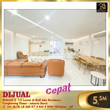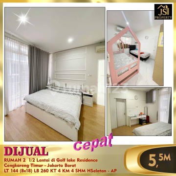DIJUAL RUMAH 2 1/2 Lantai di Golf lake Residence Cengkareng Timur - Jakarta Barat Luas Tanah 144 m² Dimensi 8 x18 m² Luas Bangunan 260 m² 2 1/2 Lantai Kamar Tidur 3 + 1 ART Kamar Mandi 3 + 1 Siap Huni Semi Furnish Listrik 4.400 Watt Air PAM Sertifikat SHM Hadap Selatan Bebas Banjir, Dekat dengan sekolahan Harga Rp 5,5 M Nego