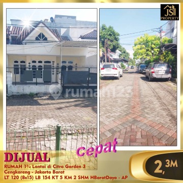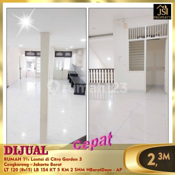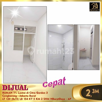 DIJUAL RUMAH 1¾ Lantai di Citra Garden 3 Cengkareng - Jakarta Barat Bebas Banjir, Dekat dengan sekolahan Maitreya, Mahabodhi, Citra Kasih, Cong Ming,RS Ciputra, Mall Sedayu, Bandara Soekarno Hatta Luas Tanah 120 m² Dimensi 8 X 15 m² Luas Bangunan 154 m² 1 ¾ Lantai Kamar Tidur 4 + 1 ART Kamar Mandi 2 Listrik 5500 Watt Air WTP Sertifikat SHM Hadap Barat Daya Harga 2.3M Nego Info & survey , hub : Fenny - JS Property 0821xxxxxxxx