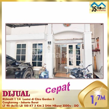 DIJUAL RUMAH 1 1/4 Lantai di Citra Garden 3 Cengkareng - Jakarta Barat Bebas Banjir, Dekat dengan RS Ciputra , Sekolah Mahabodi, Citra Kasih, 15 menit ke bandara Soeta Luas Tanah 90 m² Dimensi 6 x 15 m² Luas Bangunan 100 m² 1 1/4 Lantai Kamar Tidur 2 + 1 ART Kamar Mandi 2 Listrik 3.500 Watt Air WTP Sertifikat SHM Hadap Barat Harga 1,6 M Nego tipis info & survey , hub : fenny - JS Property 0821xxxxxxxx