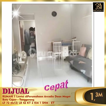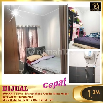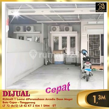 DIJUAL RUMAH 1 Lantai diPerumahaan Arcadia Daan Mogot Batu Ceper - Tanggerang Dekat sekolah2, dekat bandara, dekat Kulineran dan strategis Luas Tanah: 72 m² Dimensi 6 x 12 m² Luas Bangunan 42m² Kamar Tidur 2 Kamar Mandi 1 1 Lantai Garasi/carport: 1 Sertifikat: SHM Harga: 1,3M Nego - ET