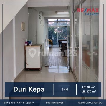 DIJUAL/DISEWA MURAH !! RUKO SIAP PAKAI LOKASI STRATEGIS Duri Kepa - Jakarta Barat LT : 4 × 15.5 (62 M²) LB : -/+ 270 M² Bangunan 4.5 Lantai Furnished ex Kantor SHM KM : 4 2 Line Telepon Listrik 7700 Watt Air PAM & Air Sumur Hadap Timur Bebas Banjir Lebar Jalan 2 Mobil Lokasi Sangat Strategis Dekat Pusat Kuliner 5 Menit ke Mall Taman Anggrek & Mall Central Park Cocok untuk Kantor , Toko Online , Tempat Kursus , Dll Direct Owner (FL) Harga Jual : 2.9 Miliar Harga Sewa : 135 Juta/Tahun (Minimal Sewa 2 Tahun) Felicia RE/MAX HARVEST 0813xxxxxxxx