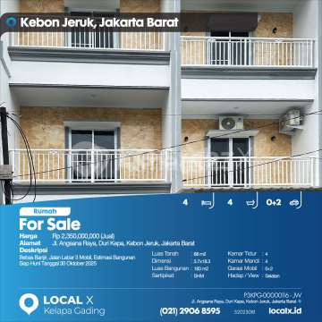Bebas Banjir, Jalan Lebar 3 Mobil, Estimasi Bangunan Siap Huni Tanggal 30 Oktober 2025 For Sale - Jual Rumah Angsana Raya, Duri Kepa, Kebon Jeruk, Jakarta Barat Harga. Rp 235000xxxxJual) Deskripsi Properti. Bebas Banjir, Jalan Lebar 3 Mobil, Estimasi Bangunan Siap Huni Tanggal 30 Oktober 2025 Luas Tanah. 68 m2 Dimensi. 3.7x18.3 Luas Bangunan. 183 m2 Sertipikat. SHM Kamar Tidur. 4 Kamar Mandi. 4 Garasi Mobil. 0+2 Hadap / View. Selatan LOCAL X Kelapa Gading ******** ⓪②① ②⑨⓪⑥ ⑧⑤⑨⑤ P3KPG-0000xxxx-JW-J