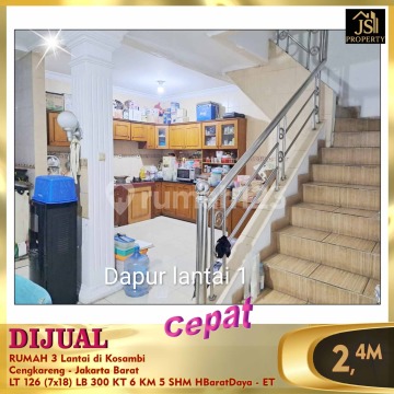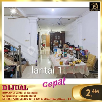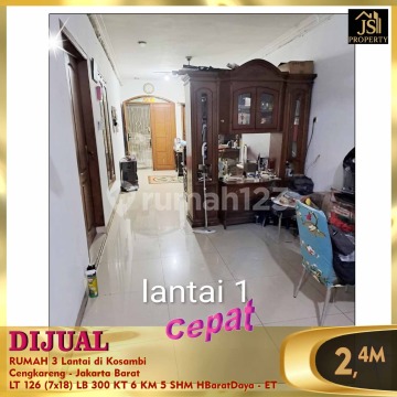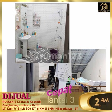DIJUAL RUMAH 3 Lantai di Kosambi Cengkareng - Jakarta Barat Luas Tanah 126 m² Dimensi 7x18 m² Luas Bangunan 300 m² 3 Lantai Kamar Tidur 5 + 1 ART Kamar Mandi 4 + 1 Semi Furnish Listrik 11.000 Watt Air PAM Sertifikat SHM Hadap Barat Daya Bebas Banjir, Akses Transportasi Mudah, Strategis Harga 2,4 M Nego Hub : Fenny - JS Property 0821xxxxxxxx