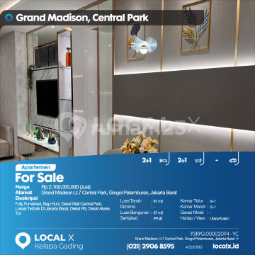 Fully Furnished, Siap Huni, Dekat Mall Central Park, Lokasi Terbaik Di Jakarta Barat, Dekat RS, Dekat Akses Tol For Sale - Jual Apartemen Grand Madison Lt.7 Central Park, Grogol Petamburan, Jakarta Barat Harga. Rp 2,100,000,000 (Jual) Deskripsi Properti. Fully Furnished, Siap Huni, Dekat Mall Central Park, Lokasi Terbaik Di Jakarta Barat, Dekat RS, Dekat Akses Tol Luas Tanah. 67 m2 Dimensi. - Luas Bangunan. 67 m2 Sertipikat. PPJB Kamar Tidur. 2+1 Kamar Mandi. 2+1 Garasi Mobil. - Hadap / View. Utara/Kolam Renang LOCAL X Kelapa Gading ******** ⓪②① ②⑨⓪⑥ ⑧⑤⑨⑤ P3KPG-0000xxxx-YC-J