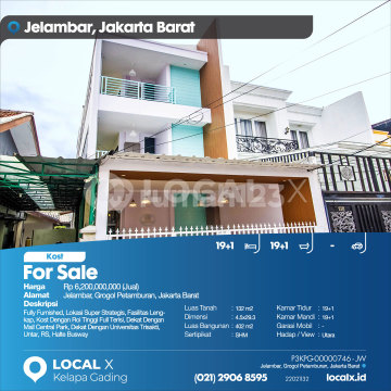 Fully Furnished, Lokasi Super Strategis, Fasilitas Lengkap, Kost Dengan Roi Tinggi Full Terisi, Dekat Dengan Mall Central Park, Dekat Dengan Universitas Trisakti, Untar, RS, Halte Busway For Sale - Jual Kost Jelambar, Grogol Petamburan, Jakarta Barat Harga. Rp 620000xxxxJual) Deskripsi Properti. Fully Furnished, Lokasi Super Strategis, Fasilitas Lengkap, Kost Dengan Roi Tinggi Full Terisi, Dekat Dengan Mall Central Park, Dekat Dengan Universitas Trisakti, Untar, RS, Halte Busway Luas Tanah. 132 m2 Dimensi. 4.5x29.3 Luas Bangunan. 402 m2 Sertipikat. SHM Kamar Tidur. 19+1 Kamar Mandi. 19+1 Garasi Mobil. - Hadap / View. Utara LOCAL X Kelapa Gading ******** ⓪②① ②⑨⓪⑥ ⑧⑤⑨⑤ P3KPG-0000xxxx-JW-J