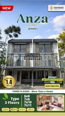 Anza Homes @ Malibu Village adalah produk hunian rumah 3 lantai terbaru oleh pengembang Paramount Land di kawasan Gading Serpong, Tangerang. Cluster Anza Homes dirancang dengan konsep bangunan rumah modern, tata ruangan efisien dan fungsional untuk memenuhi kebutuhan keluarga masa kini. Memiliki lokasi strategis dalam kawasan kota mandiri Gading Serpong, cluster Anza Homes menawarkan rumah tiga lantai dengan pilihan beberapa tipe ukuran lebar 6 meter dan 7 meter, dimana umumnya dilengkapi tiga kamar tidur, tiga kamar mandi, serta satu carport. Dengan luas tanah mulai sekitar 48 m² dan luas bangunan hingga sekitar 119 m², rumah Anza Homes dijual pada harga jual perdana mulai dari kisaran Rp1,4 miliar dan ditujukan bagi keluarga muda atau profesional yang menginginkan tempat tinggal nyaman di lingkungan yang berkembang pesat. Hubungi langsung sales rumah Anza Homes Paramount Serpong untuk membeli rumah baru 3 lantai Gading Serpong. Tanyakan langsung mengenai unit rumah yang tersedia, promo pembelian, cara pembayaran, bank KPR kerjasama dan pertanyaan lainnya melalui whatsapp sales admin yang memasarkan rumah Anza Homes di Gading Serpong. more info ari Kurniawan 0812xxxxxxxx