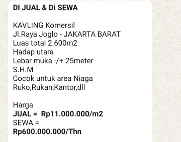Dijual Tanah Kav.Komersil di Jln Raya Joglo, Jakarta Barat Luas Tanah 2.600 m2 Lebar Muka _/+ 25 meter Hadap Utara Sertifikat Hak Milik Lokasi sangat strategis Terletak di Area Niaga Cocok utk Ruko, Rukan, Kantor dll Harga Jual seb 11 juta/m2 Untuk info lebih lanjut,bpk/ibu harap menghubungi Sandy hp no.0816169xxxx kode listing sandy-edhy2