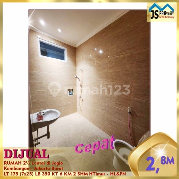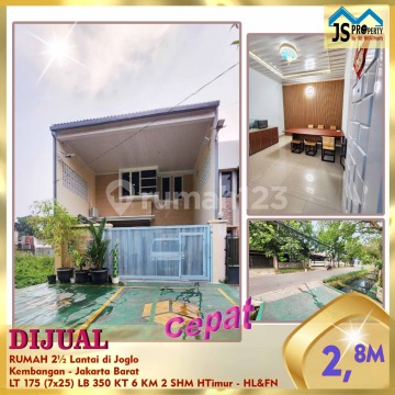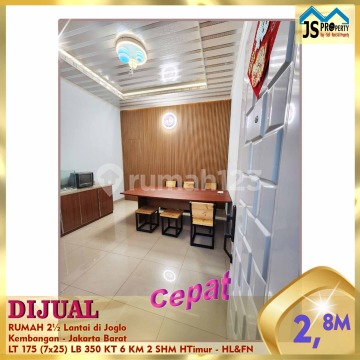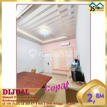 DIJUAL RUMAH 2½ Lantai di Joglo Kembangan - Jakarta Barat Hadap Timur Akses Jalan Utama Luas Tanah 175 m² Dimensi. 7 x 25 cm Luas Bangunan 350 m² Kamar tidur 6 Kamar mandi 2 2½ Lantai Full Furnished : Tidak Listrik 5.500 Watt Air Tanah Sertifikat SHM Harga 2,8 M Nego