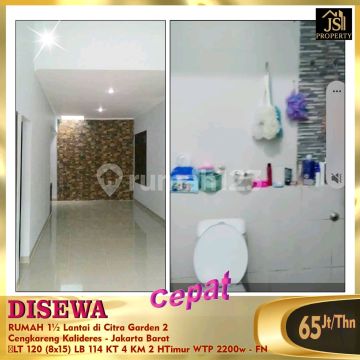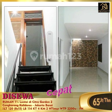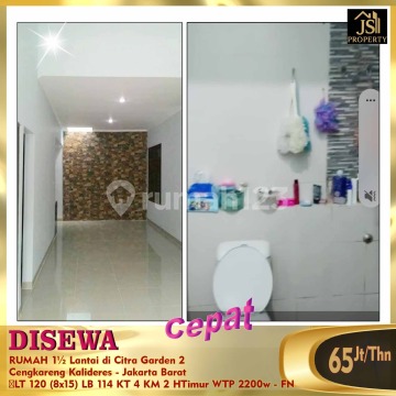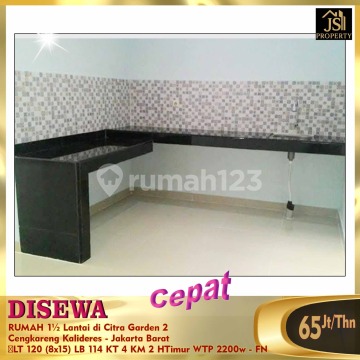 DISEWAKAN RUMAH 1½ Lantai di Citra Garden 2 Cengkareng Kalideres - Jakarta Barat Luas Tanah 120 m² Ukuran Dimensi 8x15 m² Luas Bangunan 114 m² 1½ Lantai Kamar Tidur 3+1 Kamar Mandi 2 Listrik 2200 Watt Non Furnish Air WTP Hadap Timur Siap Huni Harga 65Jt/Thn - FN