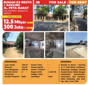 Dijual dan disewa rumah ex resto dan kavling di Kalideres Jakarta Barat Luas tanah ; 700m2 (18×38) Luas bangunan : 650m2 2 lantai Kondisi masi baik Listrik : 2200 VA SHM Cocok utk usaha dan utk gudang Harga jual : 12.5 M nego Harga sewa : 300jt/thn nego Kartini Gao 0812907xxxx *dvd*