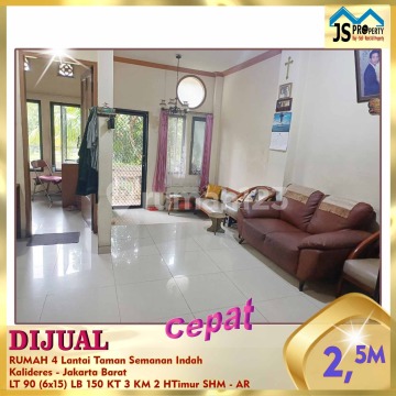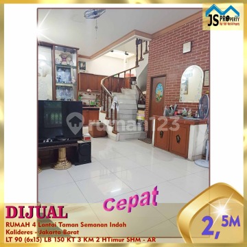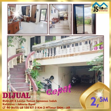 DIJUAL RUMAH 4 Lantai Taman Semanan Indah Kalideres - Jakarta Barat Rumah Seberang Taman, Bangunan Kokoh, Rapi Siap Huni, Bebas Banjir Luas Tanah 90 m² Dimensi 6x15 m² Luas Bangunan 150 m² 4 Lantai Kamar Tidur 3 Kamar Mandi 2 Listrik 2200 Watt Air PAM dan Air Tanah Sertifikat SHM Hadap Timur Harga 2,5 M Nego