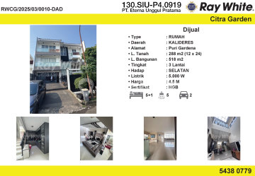 Rumah 3 lantai di Kalideres, Jakarta Barat. For sale rumah di wilayah yang asri. Properti 3 lantai bergaya minimalist modern ini berada di lingkungan strategis. Kategorinya adalah sebagai berikut: - Kamar Tidur: 5 - Kamar Mandi: 5 - Sertifikat: - - Daya Listrik: 5500 W - Hadap: Selatan - Kondisi Perabotan: Semi Furnished Tidak hanya itu, properti ini layak untuk anda dapatkan karena: - Bisa KPR. Properti berikut sudah lengkap dengan fasilitas: - Keamanan 24 jam. - Jalur Telepon. Lokasi rumah ini terjangkau, hanya selangkah menuju berbagai fasilitas utama dan menarik. Hanya Rp. 4.500.000.xxx, anda bisa langsung dapatkan rumah strategis di daerah Kalideres ini.