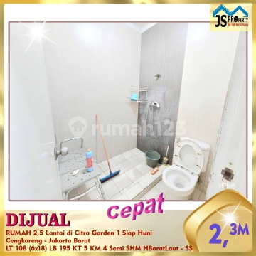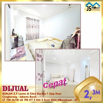 *TURUN HARGA* DIJUAL CEPAT RUMAH 2,5 Lantai di Citra Garden 1 Siap Huni Cengkareng - Jakarta Barat Luas Tanah 108 m² Dimensi 6x18 m² Luas Bangunan 195 m² 2,5 Lantai Kamar Tidur 4+1 ART Kamar Mandi 3+1 ARR Full Furnish : Semi Listrik 3.500 Watt Air WTP Sertifikat SHM Hadap Barat Laut Hal yang Menarik : Bebas Banjir Dekat taman 5 menit ke Jalan Daan Mogot Harga 1,9 M Hub : Fenny 0821xxxxxxxx