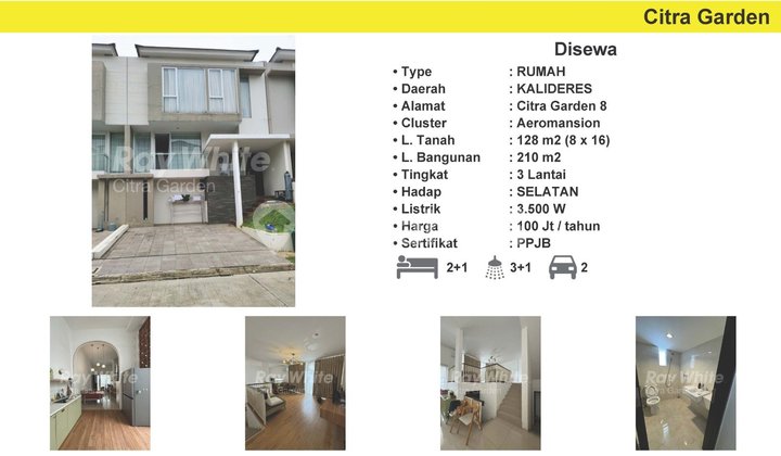 Disewakan rumah di citra garden 8 3 lantai siap huni luas tanah 8*16 luas bangunan 210 3 lantai hadap selatan daya listrik 3500 2+1 kamar tidur 3+1 kamar mandi