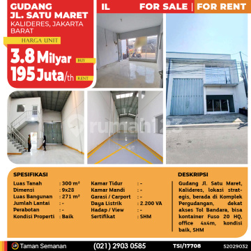 TSI/17708 For Sale / For Rent Gudang Jl. Satu Maret, Kalideres, 9x28 m², SHM Harga Rp 3.8 Milyar (Buy) / Rp 195 Juta /th (Rent) Alamat Kalideres, Jakarta Barat Deskripsi Properti Gudang Jl. Satu Maret, Kalideres, lokasi strategis, berada di Komplek Pergudangan, dekat akses Tol Bandara, bisa kontainer Fuso 20 HQ, office 4x4m, kondisi baik, SHM Luas Tanah 300 m² Dimensi 9x28 Luas Bangunan 271 m² Jumlah Lantai - Perabotan - Kondisi Baik Kamar Tidur - Kamar Mandi - Garasi / Carport - Jalur Telepon - Daya Listrik 2.200 VA Hadap / View - Sertifikat SHM LJH Realty Taman Semanan Property Help ✆ 0212903xxxx