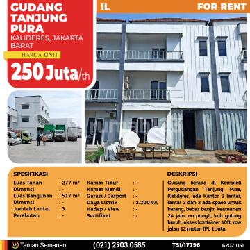 TSI/17796 For Rent Gudang Tanjung Pura, Kalideres, 277 m², 3 Lt Harga Rp 250 Juta /th Alamat Kalideres, Jakarta Barat Deskripsi Properti Gudang berada di Komplek Pergudangan Tanjung Pura, Kalideres, ada Kantor 3 lantai, lantai 2 dan 3 ada space untuk barang, bebas banjir, keamanan 24 jam, no pungli, kuli gotong buruh, akses kontainer 40ft, row jalan 12 meter, IPL 1 Juta Luas Tanah 277 m² Dimensi - Luas Bangunan 517 m² Dimensi - Jumlah Lantai 3 Perabotan - Kamar Tidur - Kamar Mandi - Garasi / Carport - Jalur Telepon - Daya Listrik 2.200 VA Hadap / View - Sertifikat - LJH Realty Taman Semanan Property Help ✆ 0212903xxxx