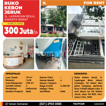 TSI/17229 For Rent Ruko Kebon Jeruk, Jakarta Barat, 7x10 m², 4 Lt, SHM Harga Rp 300.000.xxx /th Alamat Jl. Lapangan Bola, Jakarta Barat Deskripsi Properti Ruko Kebon Jeruk, Jl. Lapangan Bola, lokasi strategis, 50 meter dari jalan panjang, parkiran bisa 3 mobil depan ruko, 5 mnt akses ke Tol Kebon Jeruk, atau Tol BSD, min. sewa 2 thn, SHM Luas Tanah 70 m² Dimensi 7x10 Luas Bangunan 280 m² Jumlah Lantai 4 Perabotan Unfurnish Kondisi Baik Kamar Tidur - Kamar Mandi 4 Garasi / Carport - Jalur Telepon - Daya Listrik 3.500 VA Hadap / View - Sertifikat SHM LJH Realty Taman Semanan Property Help ✆ 0212903xxxx